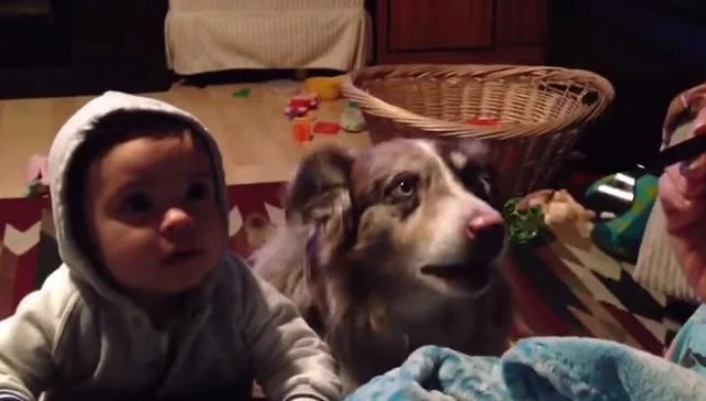 Bebé intenta hablar pero el perro se adelanta